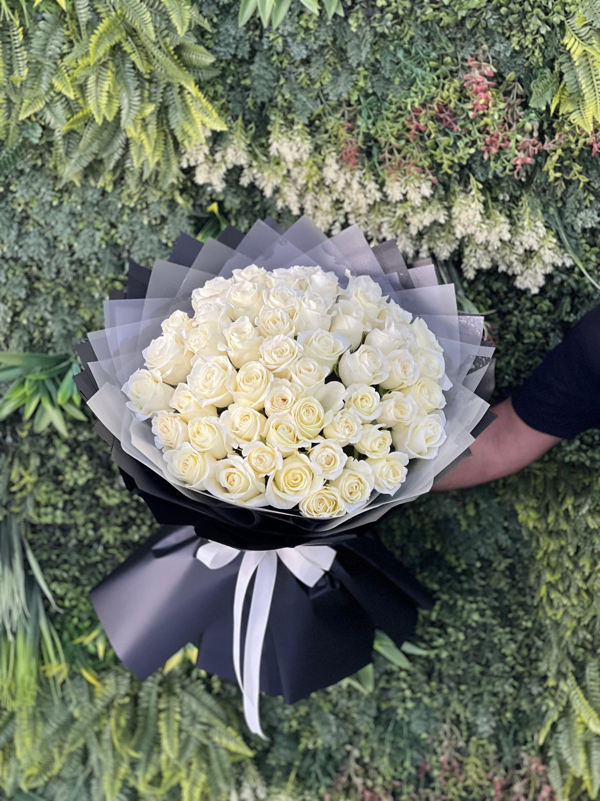 This Bouquet Contains is 51 White Roses With Stylish Bluer & Black Paper Wrapped.