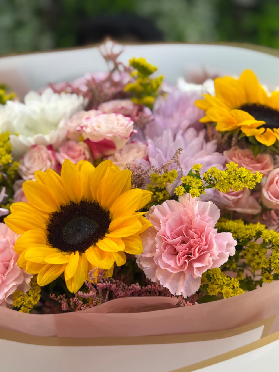 A tender tale of romance captured in blooms, Blushing Love Story brings together radiant sunflowers and delicate pink roses, carnations, and pastel chrysanthemums. Each flower reflects a chapter of love—warmth, passion, and sweet affection—beautifully wrapped in soft blush tones. Perfect for expressing heartfelt emotions, this bouquet turns every moment into a memory filled with love.