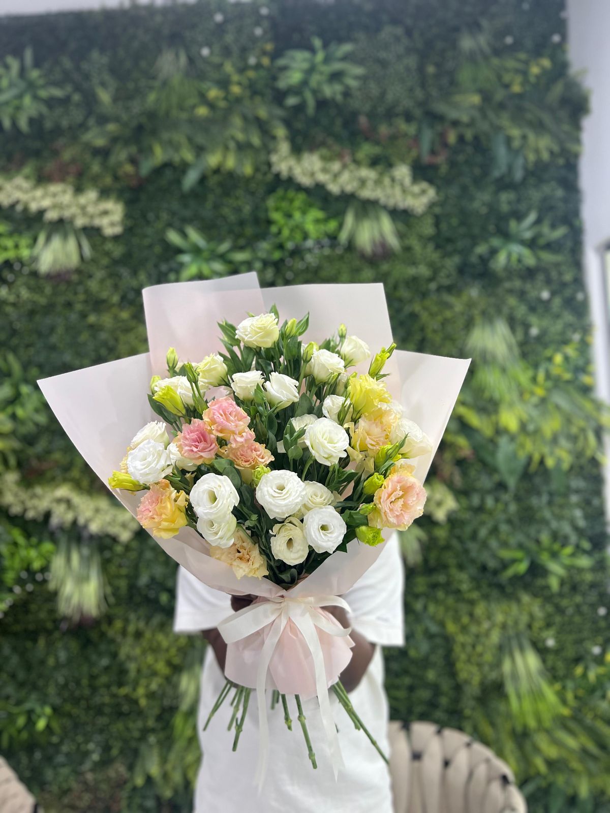 Embrace the elegance and simplicity of this mono bouquet .crafted with 8 beautiful white lisianthus flowers,it is accented by 5 delicate peach lisianthus blossoms.