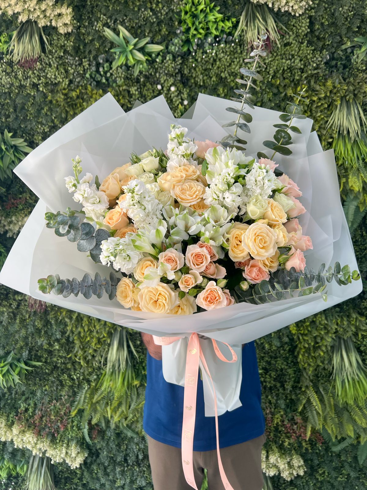 This Bouquet Contains is 6 White Matthiola ,6 White Alstroemeria,5 Peach Baby Roses,5 Sweet Sara Baby Roses,3 White Baby Roses ,6 Stems Eucalyptus Leaves With Stylish Paper Wrapped.