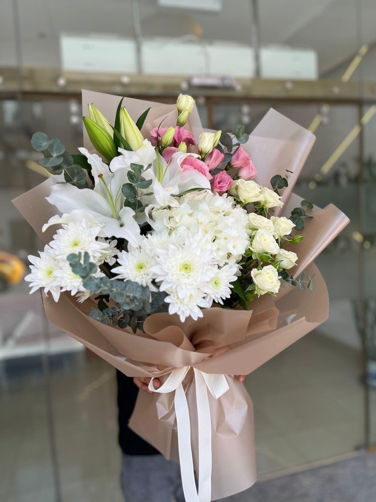 Beautiful Bouquet Is 2 Lilys, 1 White Hydrangea, 2 White Chrysanthemum, 3 Pink lisianthus, 2 White Baby Roses With Stylish Shiny Gold Paper Wreapped .