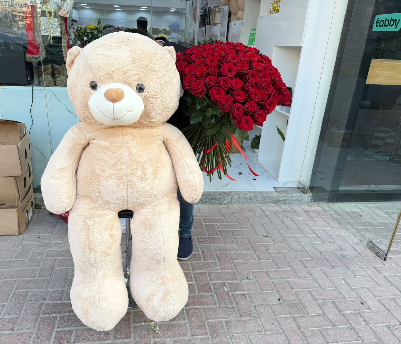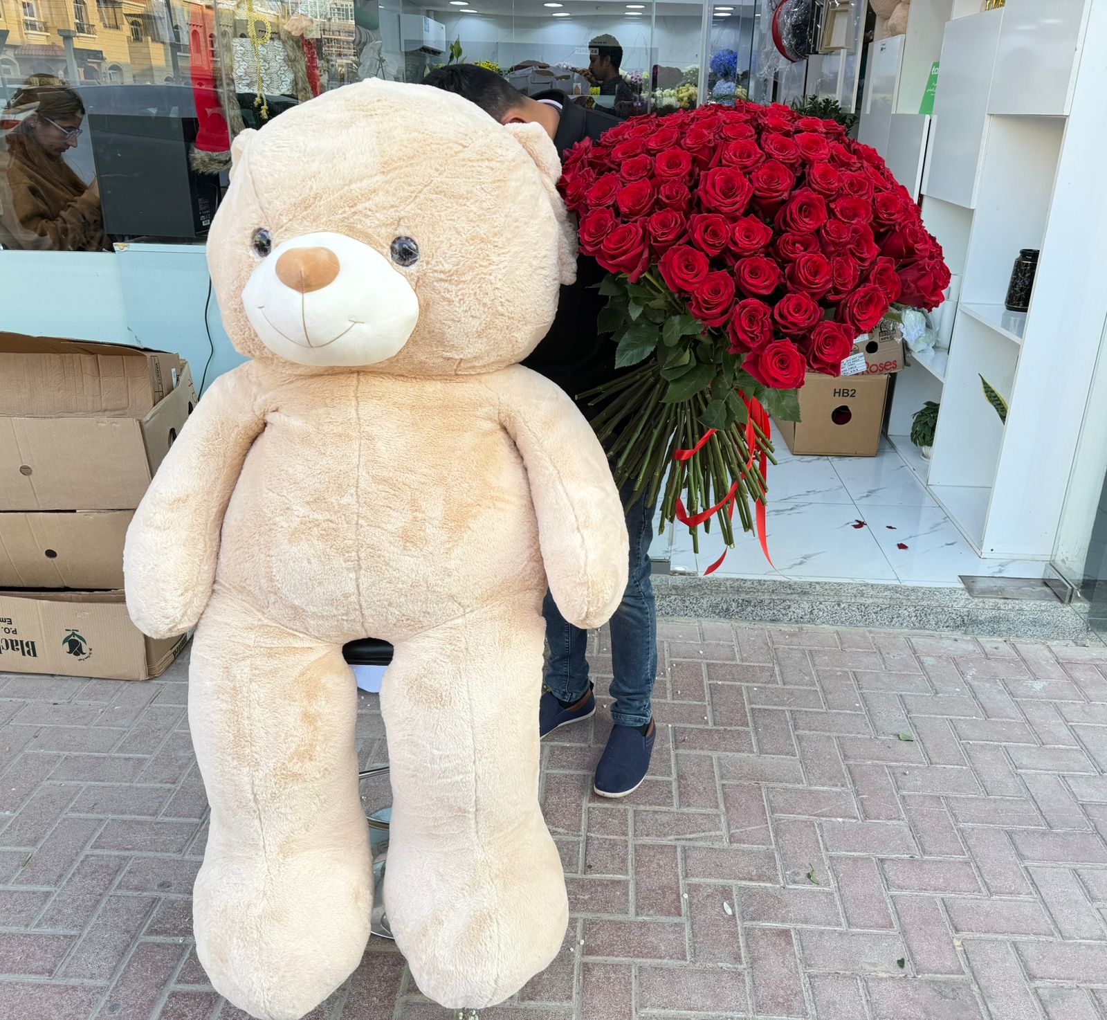 An unforgettable expression of love featuring an oversized, soft ivory 150 cm teddy bear paired with a breathtaking bouquet of deep 100 red roses. This luxurious combination speaks the language of romance, warmth, and devotion—perfect for proposals, anniversaries, or making someone feel truly cherished. A gift that delivers comfort, passion, and a lasting memory all in one. 🌹🧸
