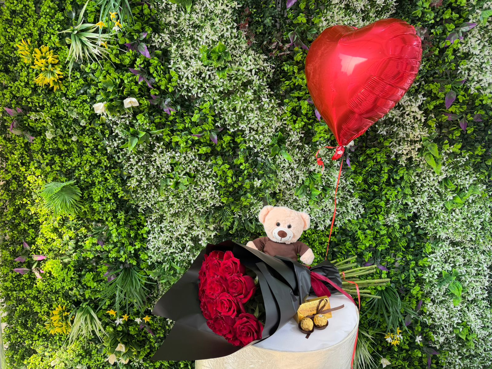 A charming romantic arrangement designed to melt hearts. Featuring elegant red roses wrapped in sleek black paper, a cute teddy bear, indulgent chocolates, and a floating red heart balloon, this setup is a perfect blend of sweetness and passion. Ideal for birthdays, anniversaries, proposals, or simply to say “I love you” in the most memorable way.