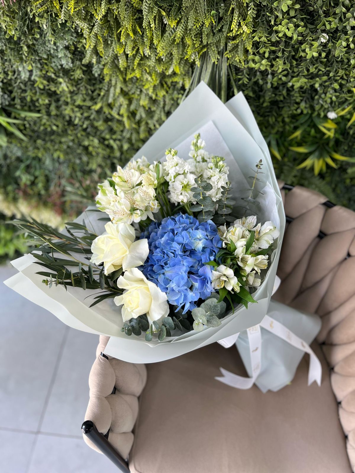 This Bouquet Contains is 1 Blue Hydrangea,3 Stems Mathhiola,4Â Stems White Alstoemeria ,2 White Roses,1 Stems Parvifolia,2 Stems Eucalyptus Leaves With Stylish Paper Wrapped.
