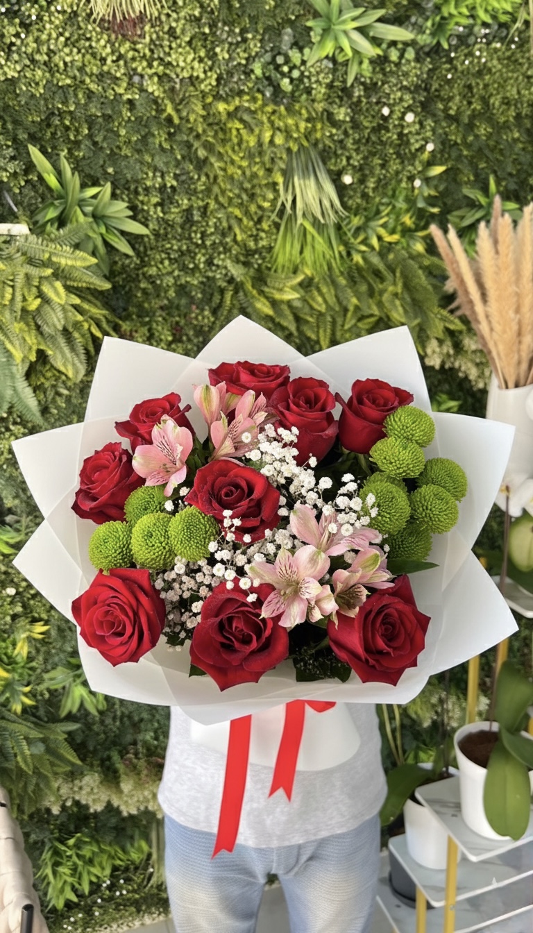 This beautiful bouquet contains 9 Fresh Red Roses, 2 Stems Alostroemeria, 2 Stems Green Button and 2 stems baby breaths in a stylish wrapping.