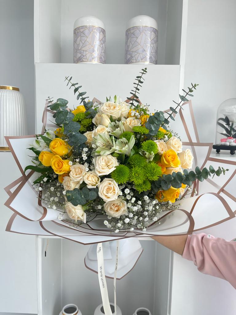 4 Yellow baby roses, 4 Peach baby roses, 4 Green buttons,2 alstromeria ,gypso , Eucalyptus in a beautiful wrapping.