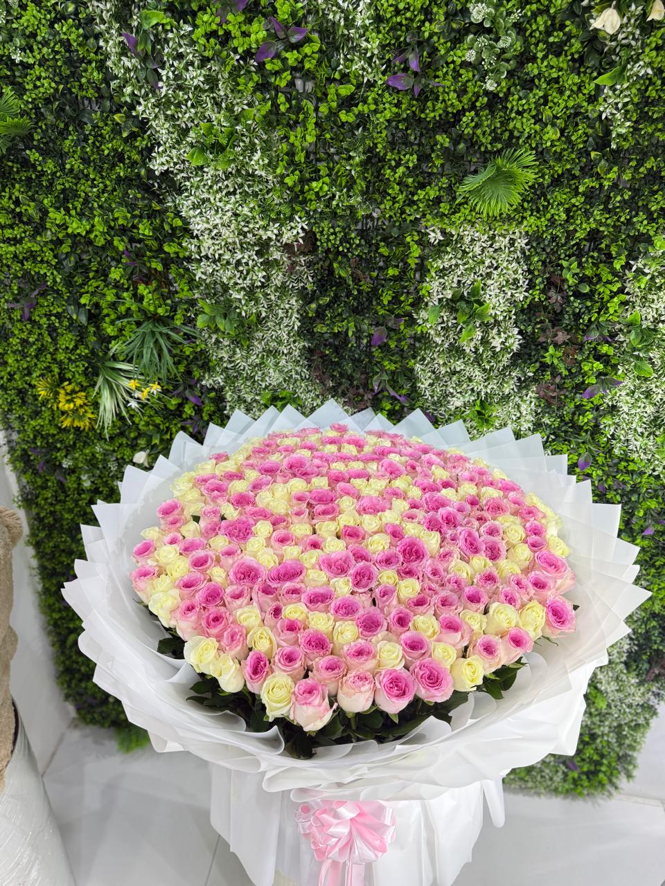A stunning round bouquet of soft pink and ivory roses, symbolizing sweetness, grace, and heartfelt emotions. Wrapped in elegant white layers and finished with a gentle ribbon, Pastel Promise is perfect for celebrating love, new beginnings, and unforgettable moments.