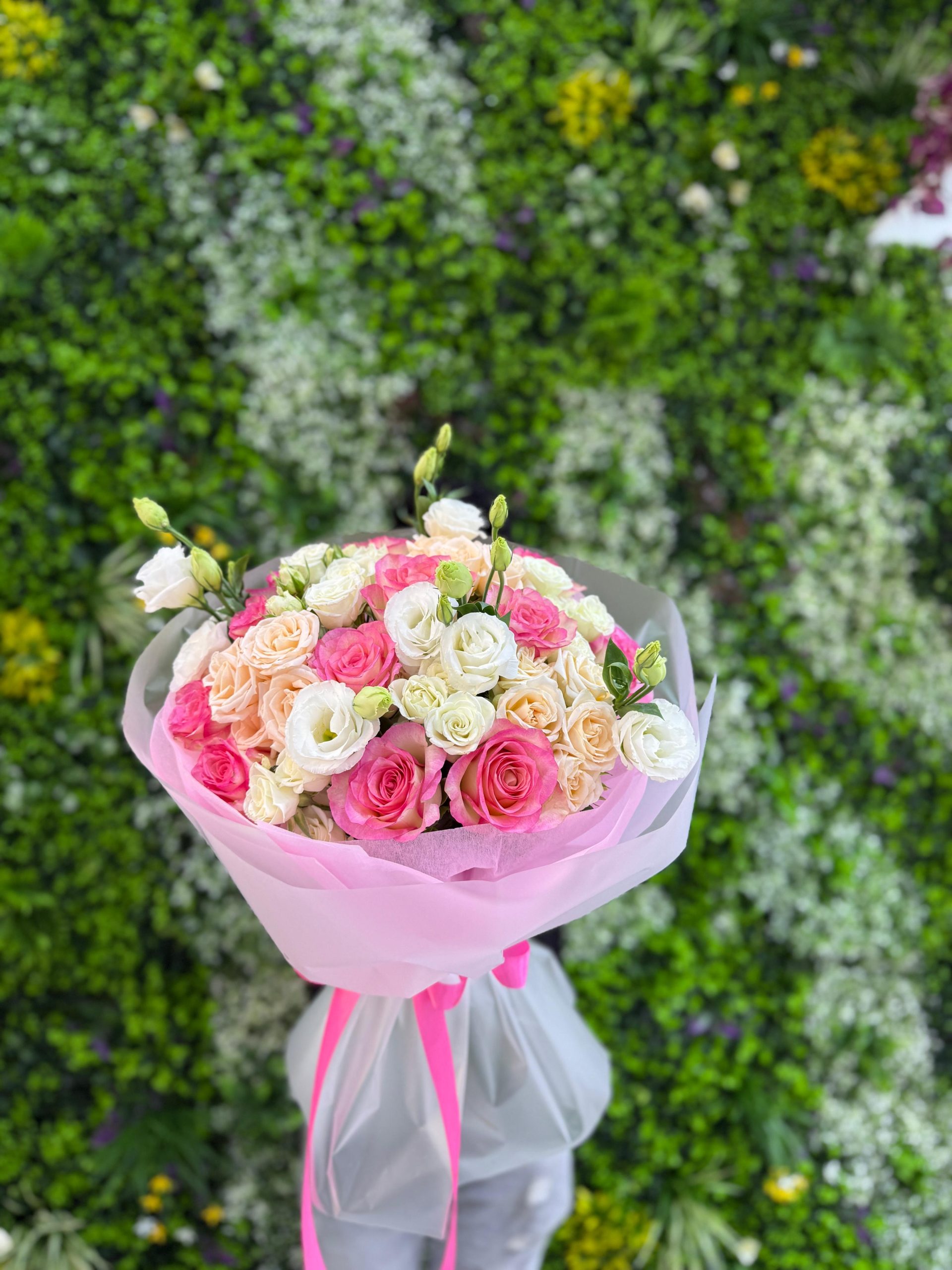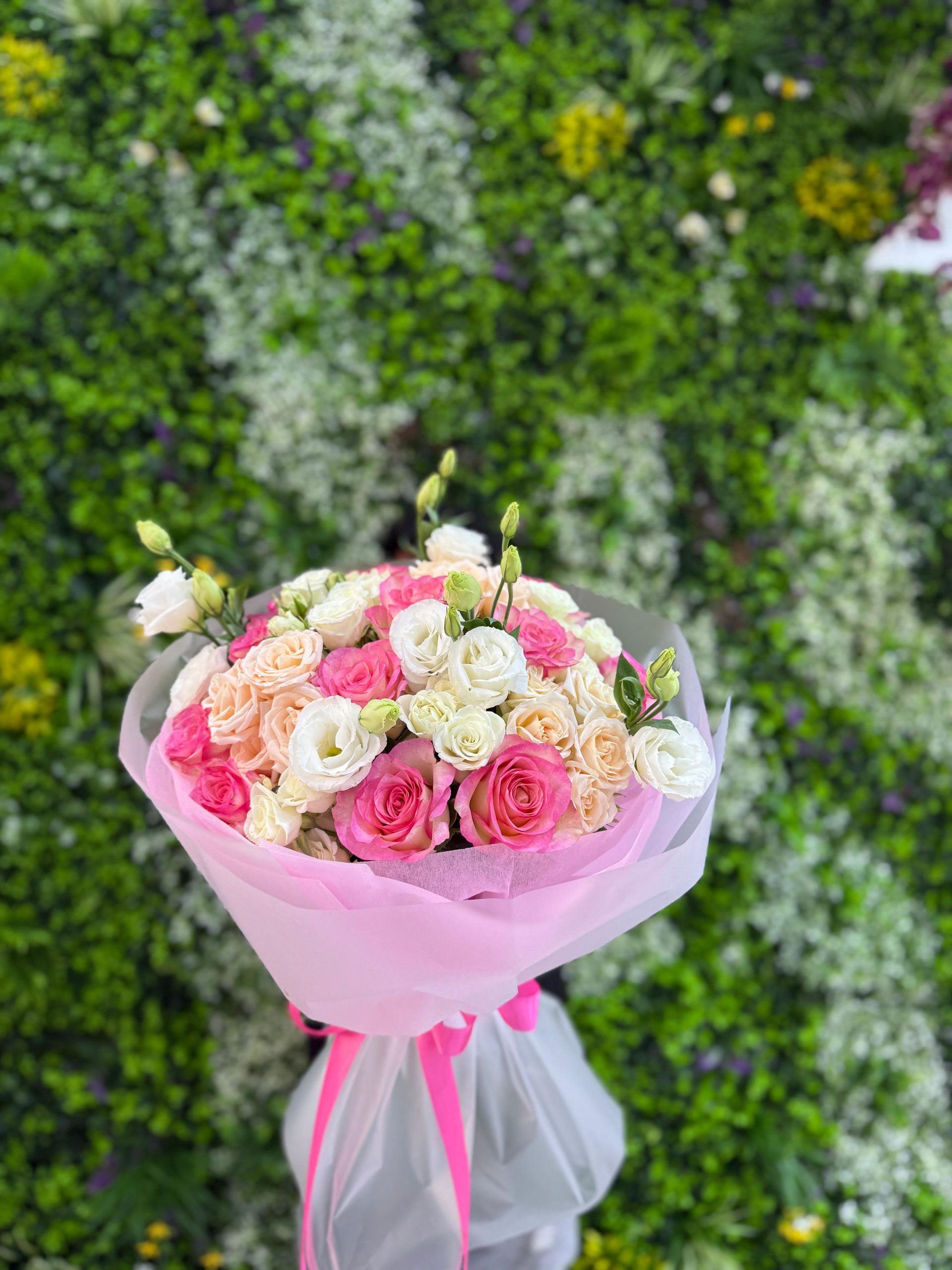 Soft, dreamy, and effortlessly romantic — the Pink Whisper Bouquet is a delicate harmony of pastel roses in shades of blush, cream, and peach. Accented with fresh buds and wrapped in layers of sheer pink and white paper tied with a bright pink ribbon, this bouquet captures the essence of tender affection. Perfect for birthdays, anniversaries, or simply brightening someone’s day with a gentle touch of love and beauty.