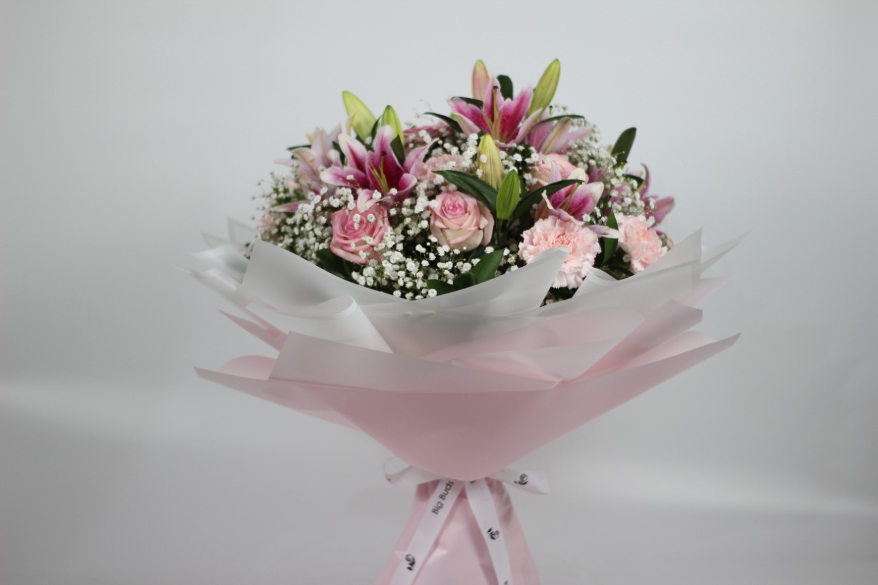 Harmonious blend of 4 lilies, 20 carnations, 20 roses and 5 stems baby breaths creates a stunning bouquet.