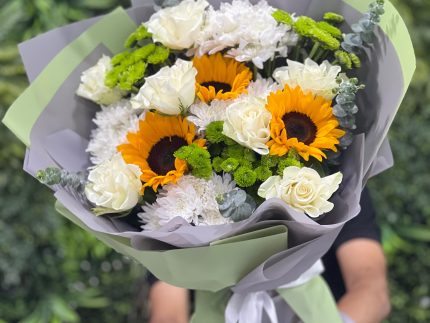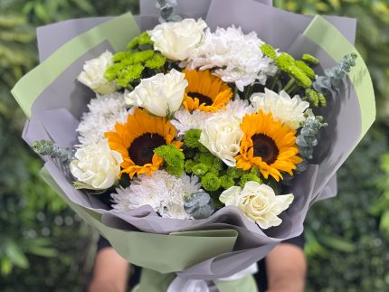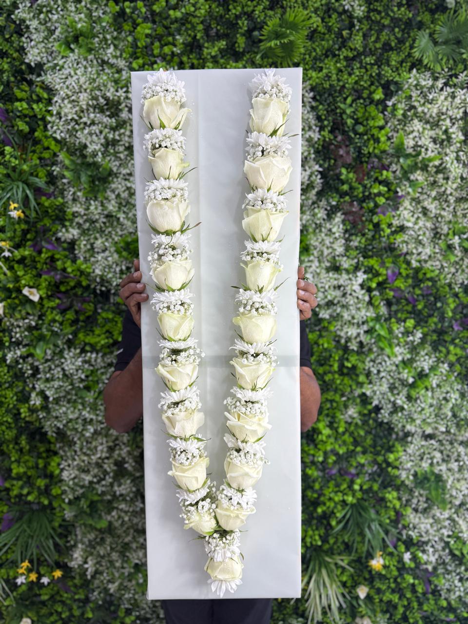 A graceful garland crafted with pristine white roses and delicate white fillers, symbolizing purity, peace, and new beginnings. Elegantly designed for weddings, engagements, or special ceremonies, this garland embodies timeless beauty and serene sophistication.