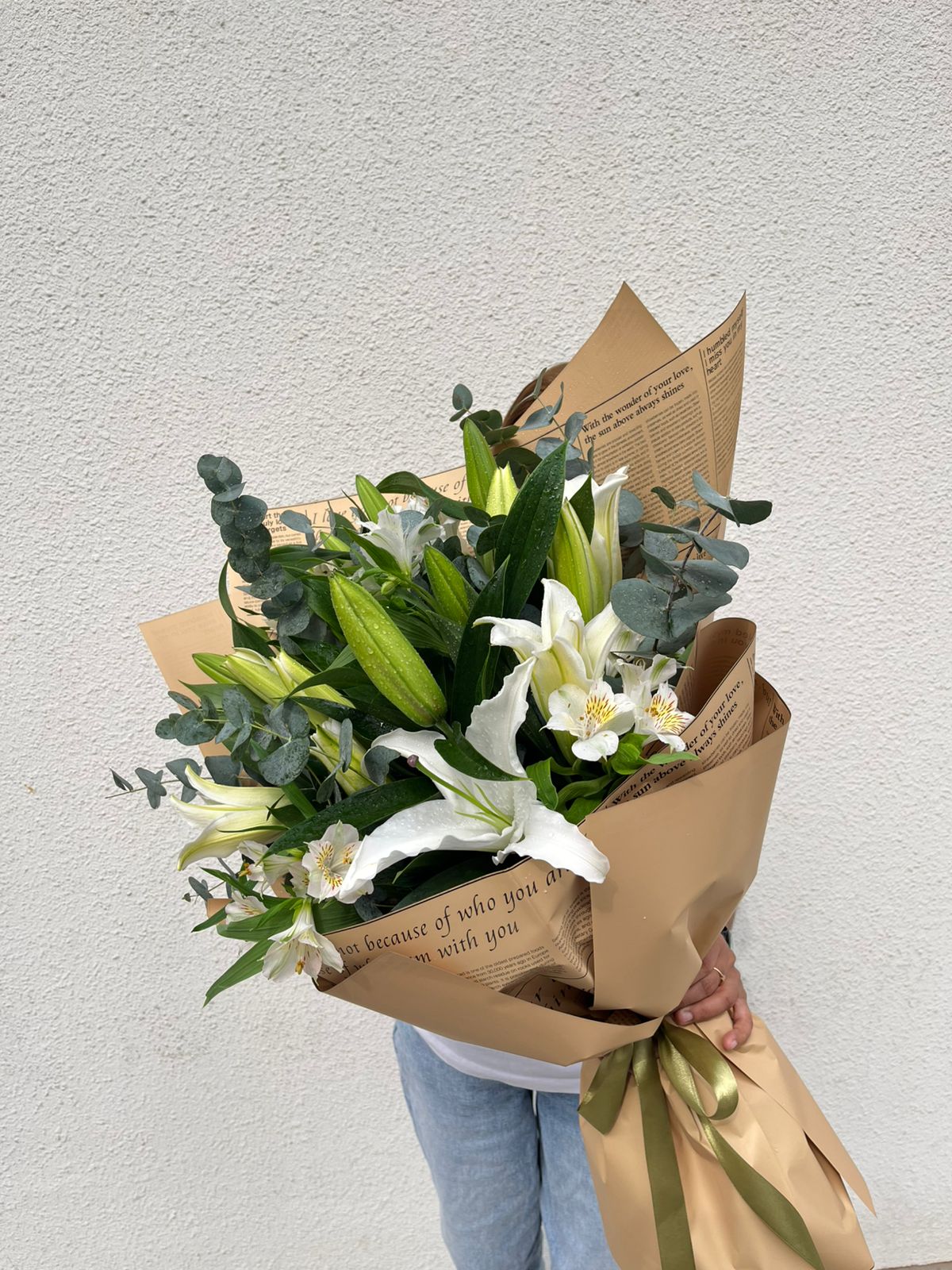 Graceful and refined, the Pure Serenity Lily Bouquet features radiant white lilies paired with soft alstroemerias and fresh eucalyptus. Wrapped in warm beige tones and accented with a satin ribbon, it exudes calm, purity, and understated luxury. Perfect for celebrating meaningful moments, offering comfort, or simply bringing a touch of peaceful beauty into someone’s day.