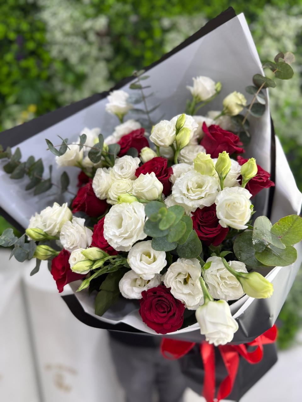 A refined blend of passionate red roses and soft ivory blooms, beautifully accented with fresh eucalyptus and wrapped in elegant monochrome paper. The Scarlet & Ivory Harmony Bouquet represents the perfect balance of love and purity—an ideal choice for anniversaries, romantic gestures, or sophisticated celebrations where elegance speaks from the heart.