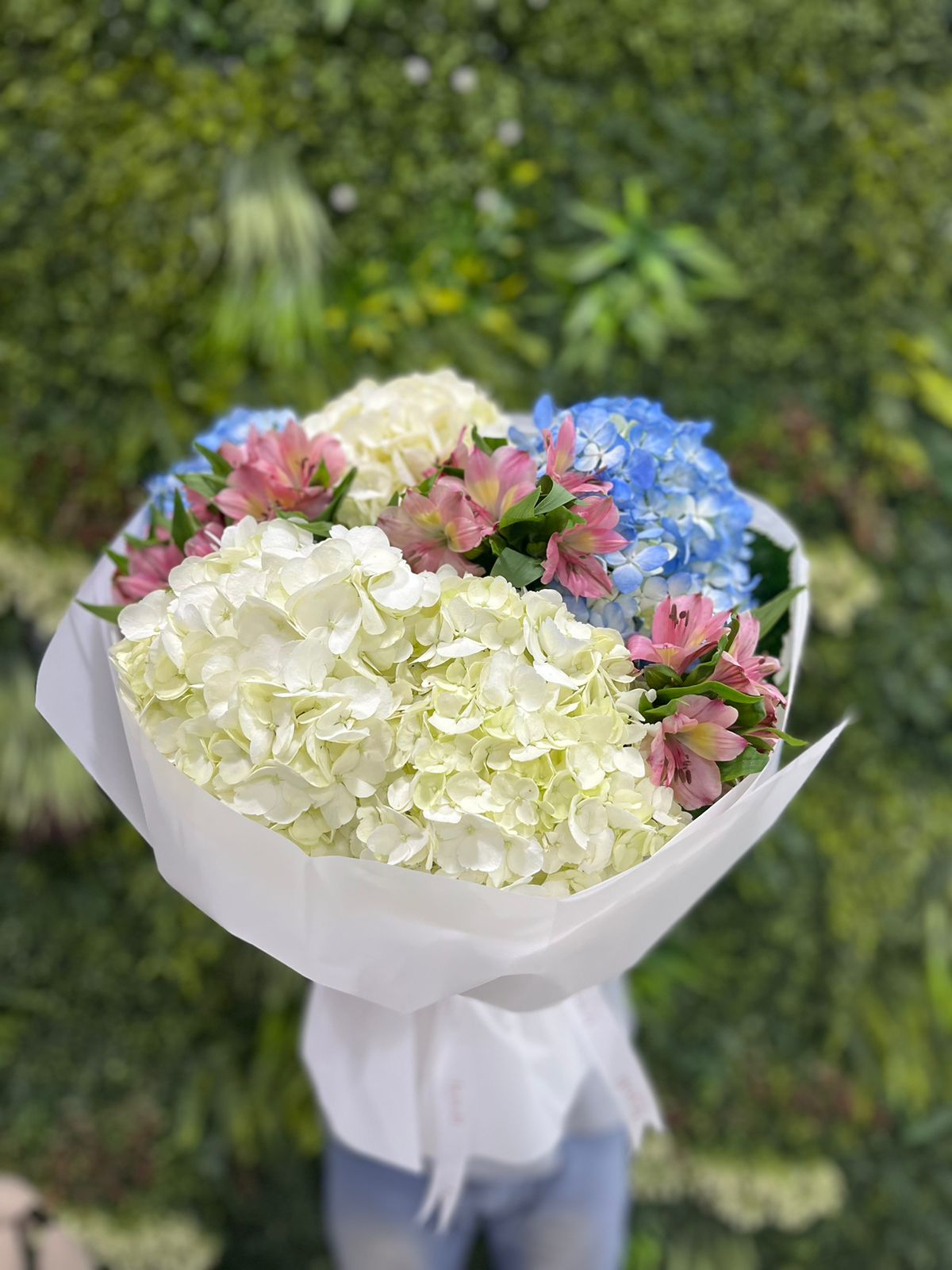 Delicate ,pastel-hued hydrangea flowers, gathered in a beautiful bouquet that’s sure to captivate the heart.