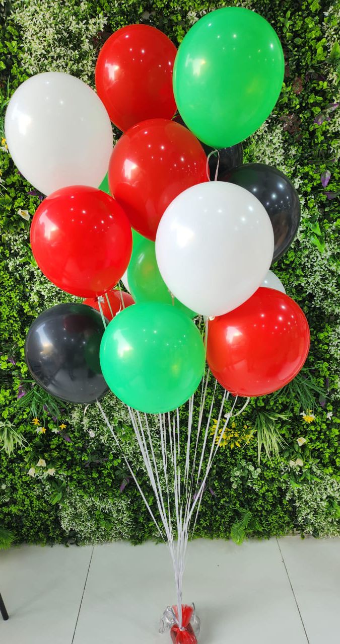A vibrant cluster of red, green, white, and black balloons beautifully gathered together, symbolizing joy, pride, and togetherness. This lively arrangement stands tall with a bright mix of festive colors, making it perfect for national celebrations, special events, or cheerful décor. The balloons rise gracefully from a neatly wrapped base, adding a bold and uplifting touch to any space.