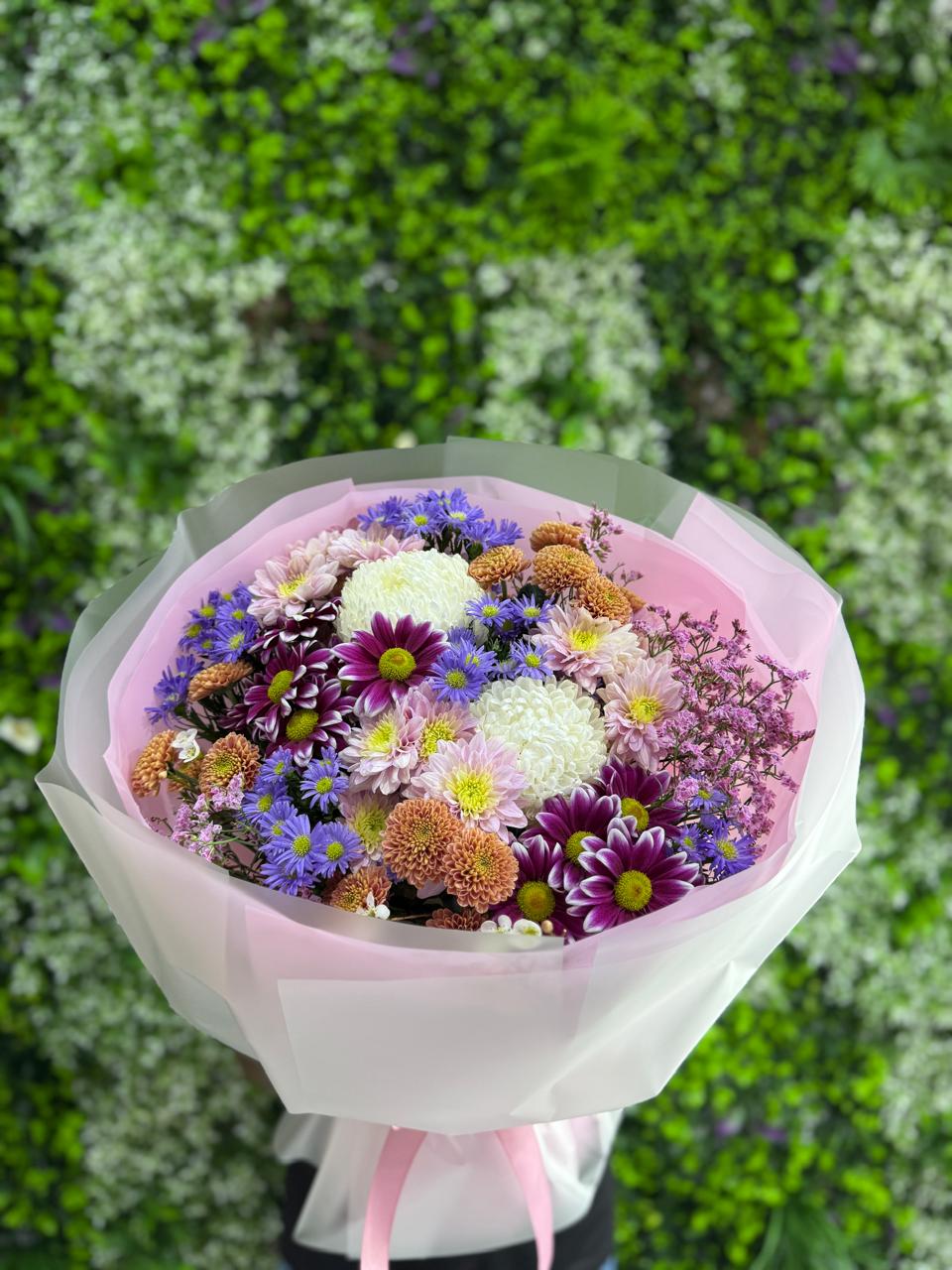 A dreamy blend of elegance and charm, the Violet Whispers Bouquet features a captivating mix of white, lilac, mauve, and deep purple blooms with touches of soft peach and periwinkle blue. Wrapped in delicate pink and white paper, this bouquet exudes a sense of calm sophistication and quiet beauty. Perfect for expressing heartfelt gratitude, admiration, or love with grace and style.
