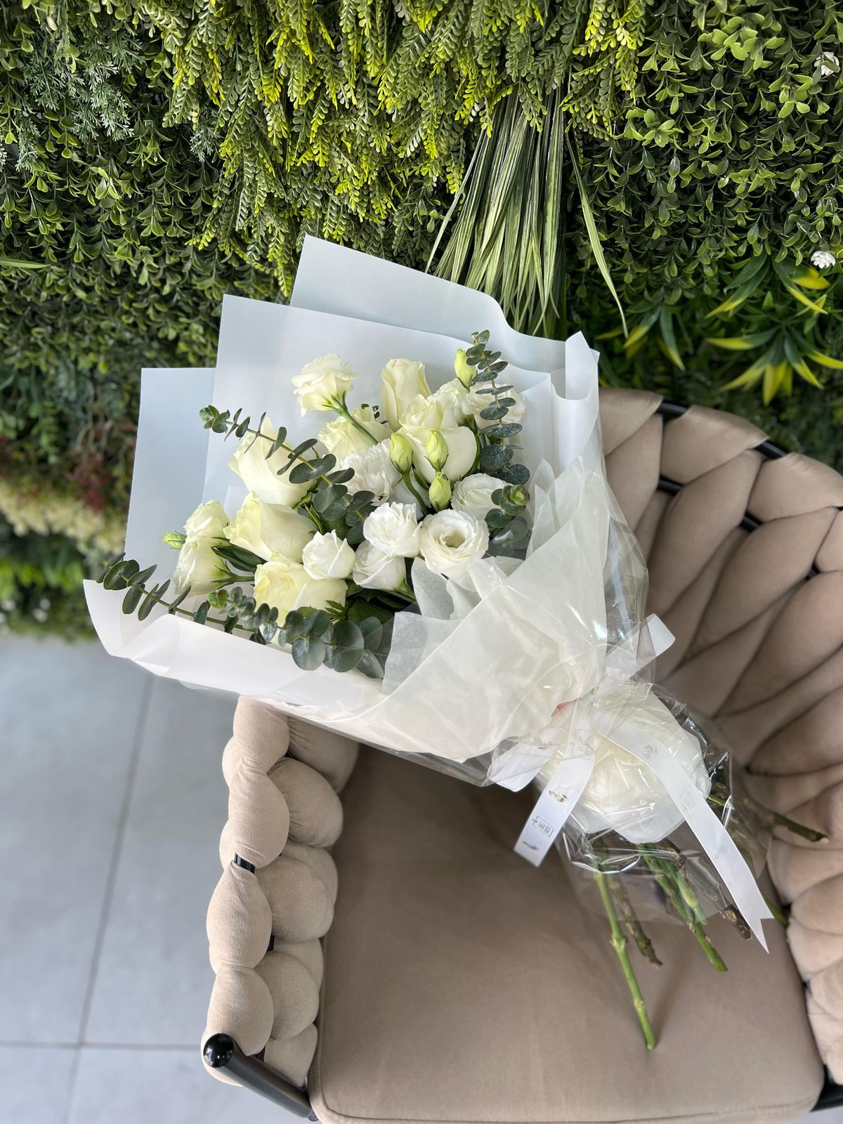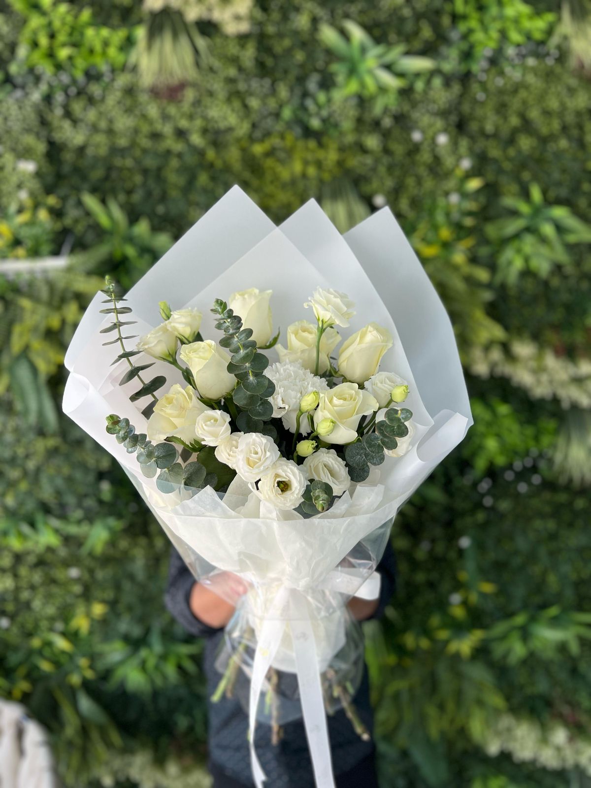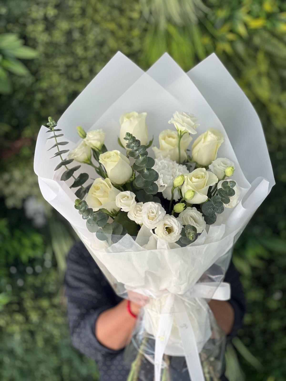 This Bouquet Contains is 6 White Roses,4 Stems White Lisiunthus,1 White Carnations ,4 Stems Eucalyptus Leaves With Stylish paper Wrapped.